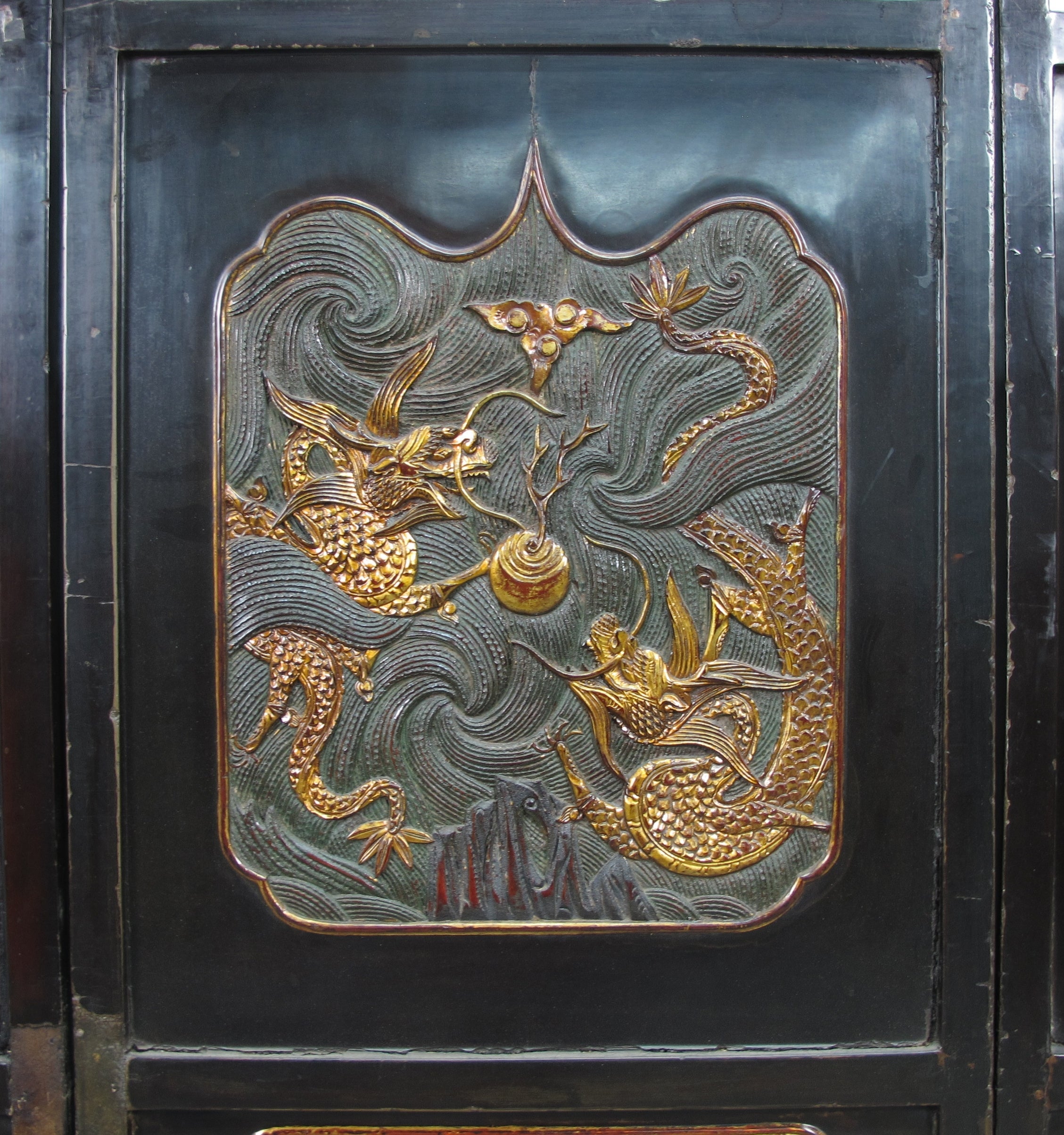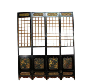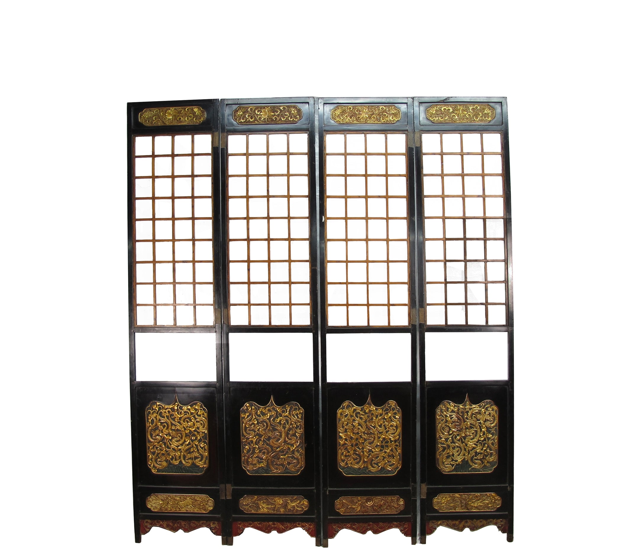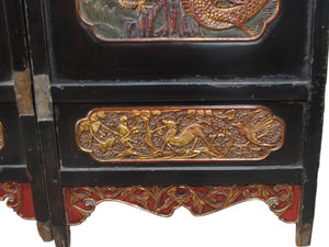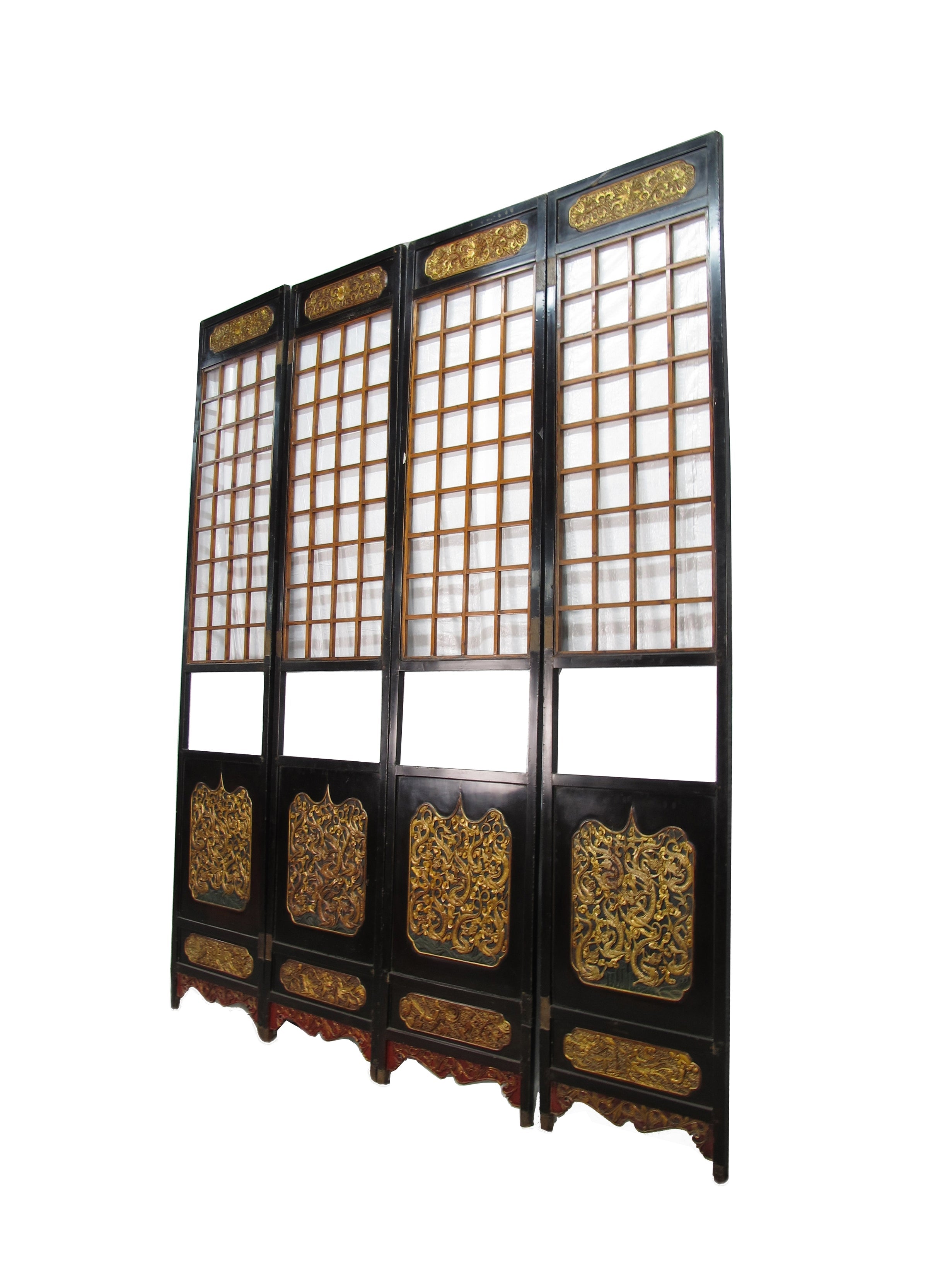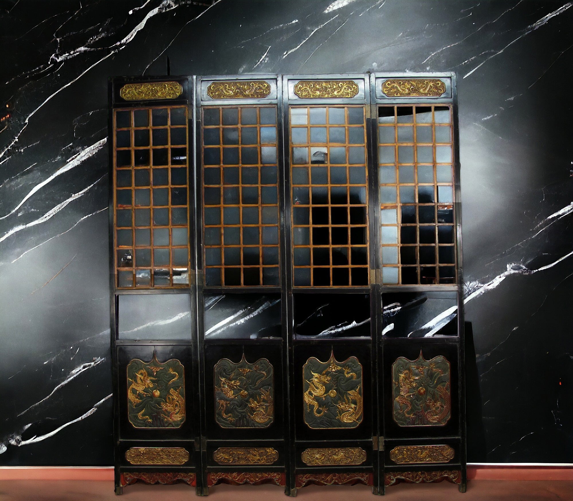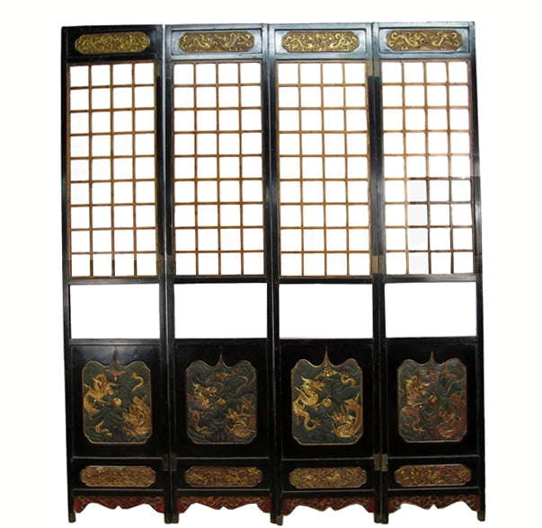 Antique Chinese Room Divider w Hand Carved & Gilded Dragons on Both Sides - Set of 4