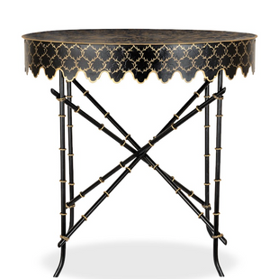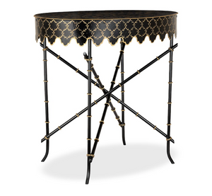 Add a touch of elegance to your space with the Trellis Scalloped Table, featuring beautifully designed metal legs that mimic the natural beauty of bamboo. The unique scalloped tabletop showcases intricate trellis patterns, creating a sophisticated focal point for any room or outdoor setting.