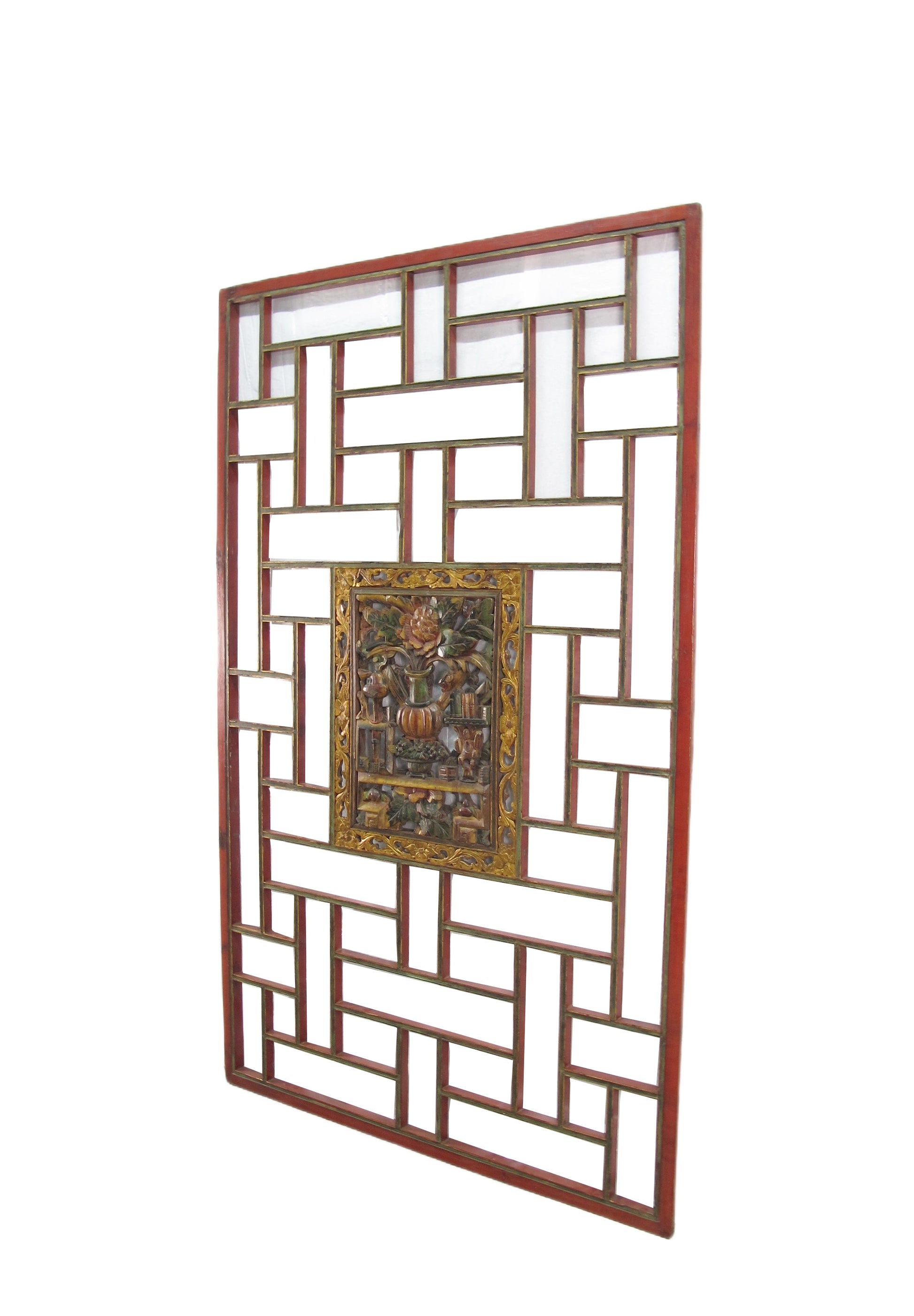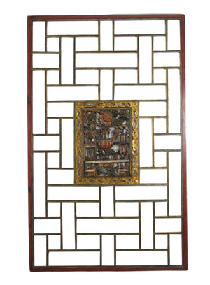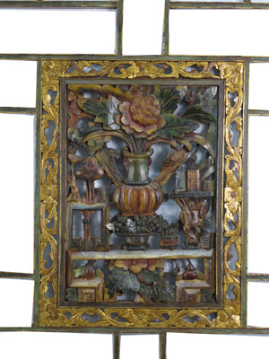 This antique wood panel was used as a wedding ceiling panel in the old China. A beautifully hand carved and painted square plate of the auspicious objects is mounted in the center of the panel. This panels balance out lines and ornament. It will be an one of kind hanging wall art or decorative headboard or ceiling or window.