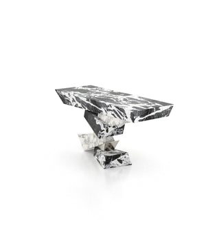 Indulge in the refined elegance of the Cubix console table, a masterpiece of geometric sophistication that commands attention in any room. Crafted as a true statement piece, this exquisite entryway table blends Arabescato Vagli and Grand Antique marble with accents of brass, satin nickel, and polished steel, creating a harmonious fusion of materials. Its architectural design, characterized by irregular rectangular shapes delicately stacked atop one another, exudes a sense of modernity and balance. With its unique composition and meticulous craftsmanship, the Cubix console table elevates your space with unparalleled sophistication and timeless allure, leaving an indelible impression on all who behold it.