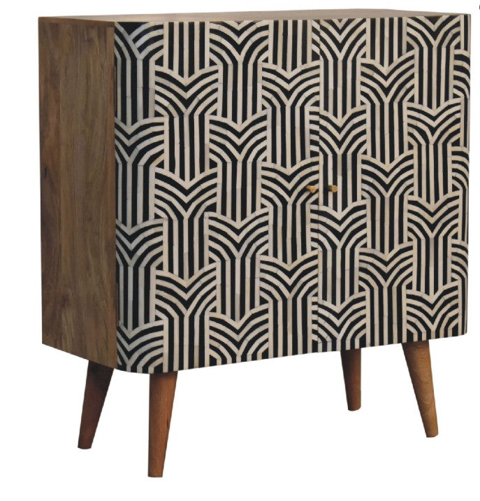 This beautiful boho inspired cabinet has been constructed from 100% solid mango wood and has a fine oak-ish finish. Other features include bone inlay front doors, and Nordic style legs. The bone inlay is sourced responsibly from deceased animals such as camels, goats, and buffaloes.