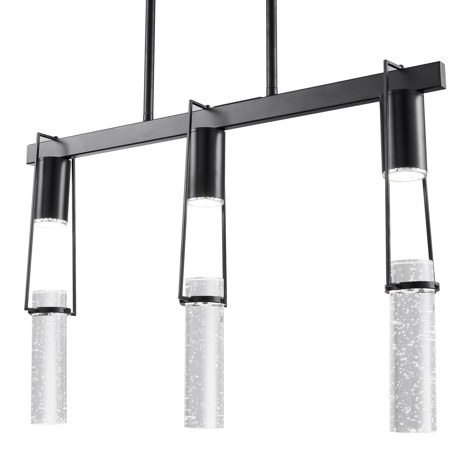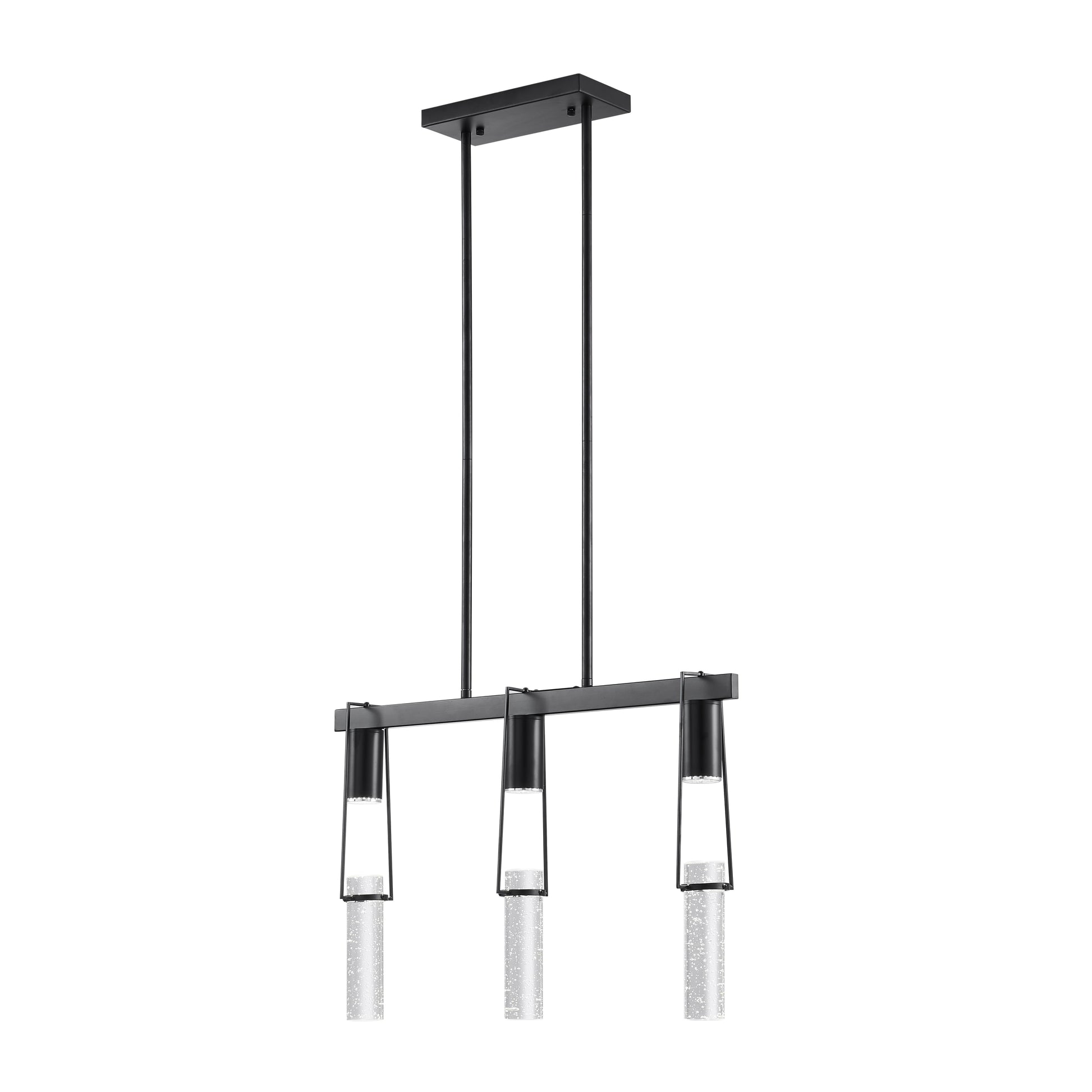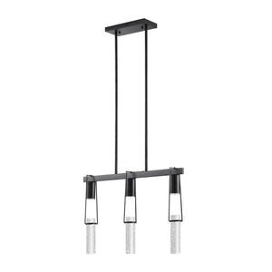 The 3 Light Harmony Chandelier in Matte Black is a 3 light crystal encased in a matte black sculpture that hangs from the ceiling with a cable length of up to 11 feet. The 3 crystals hang from a down rod that measures 25.5" in length.