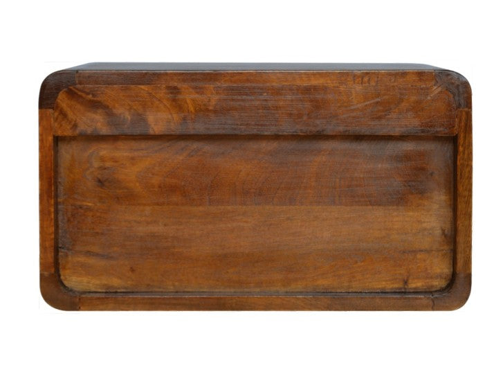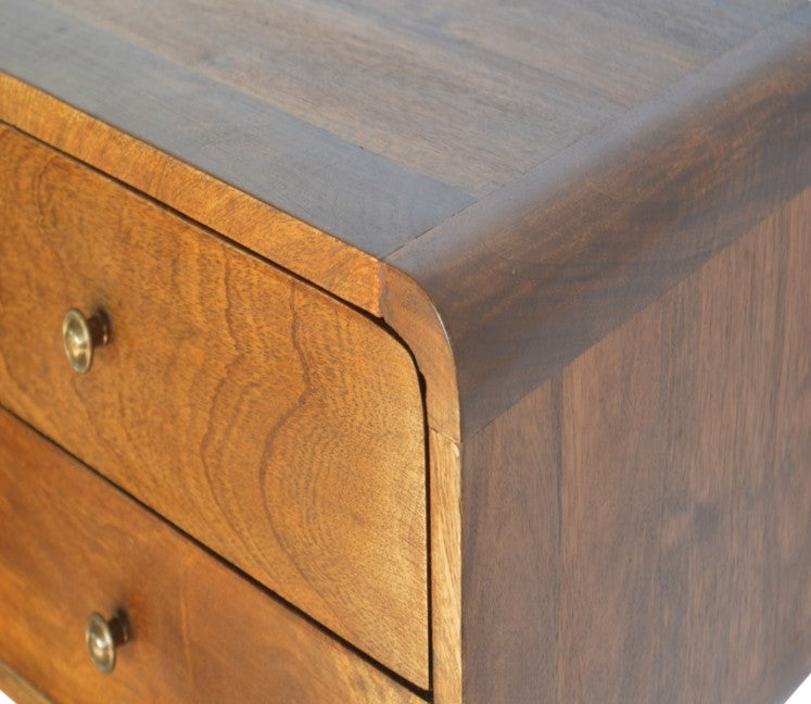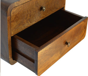Inspired by our curved range, this minimalistic wall-mounted unit has been constructed from 100% solid mango wood in a chestnut finish and features 2 drawers that feature shiny knobs. This piece is perfect for storing any bits and pieces you wish to keep close by before bedtime. Its neat and clean design can easily be mounted on the wall without the fuss of any legs. Caution! Do not sit on the unit.