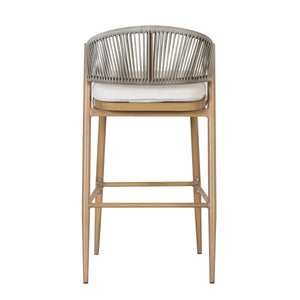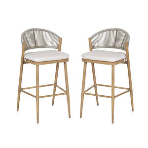 These outdoor bar height counter stools with aluminum frames and water-resistant cushions provide comfortable and stylish seating for patios, gardens, or outdoor bars. Their modern design with a maple finish complements various outdoor aesthetics.