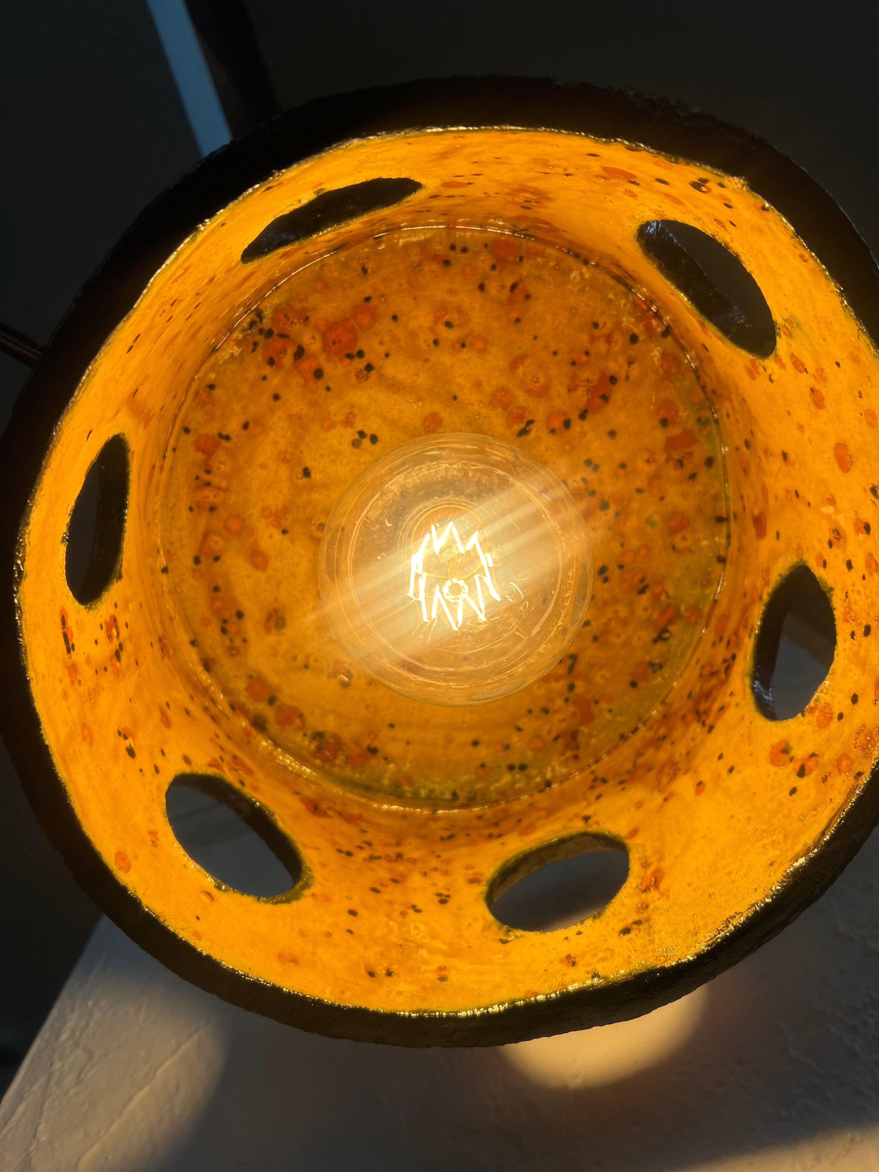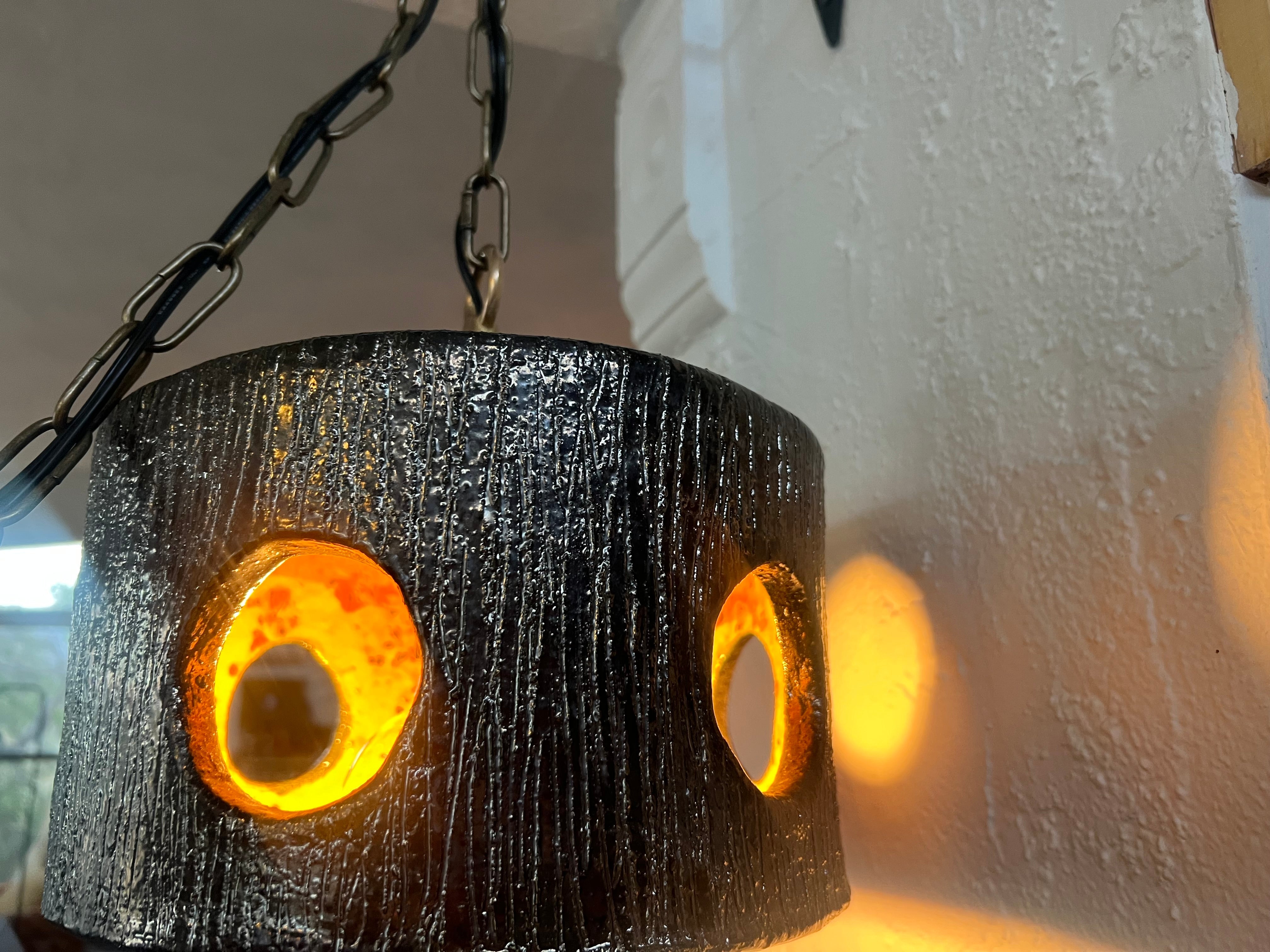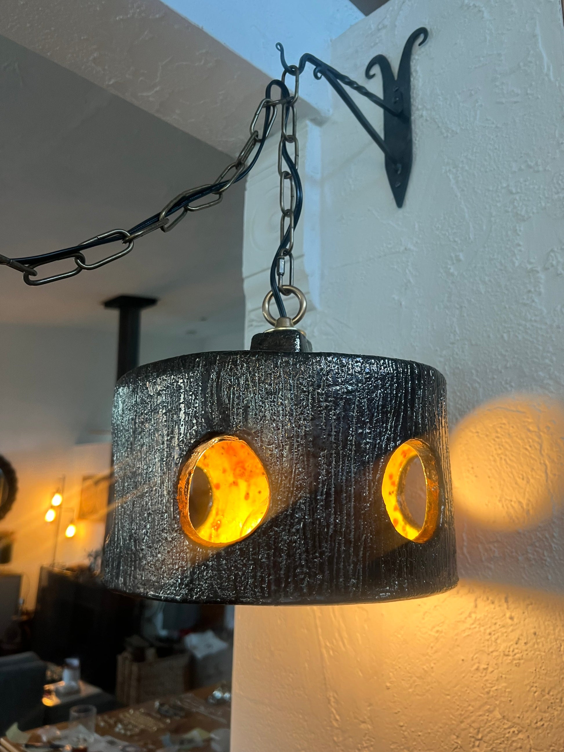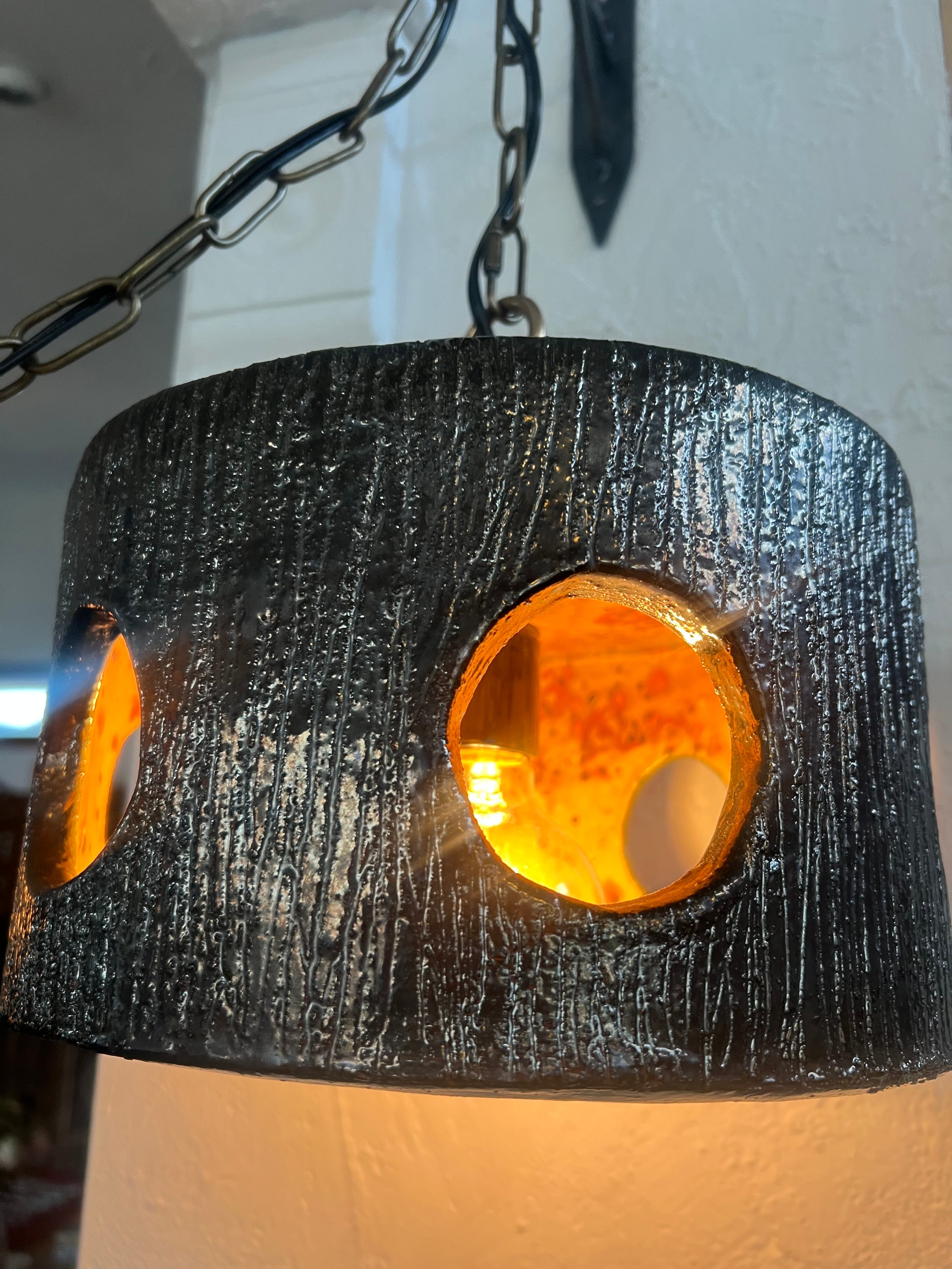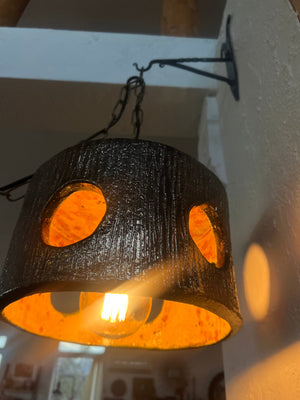 This handcrafted ceramic pendant combines mid-century inspired design with contemporary artistry. The black textured exterior contrasts beautifully with a warm, speckled "safari" glaze interior that diffuses light into captivating wall patterns.
