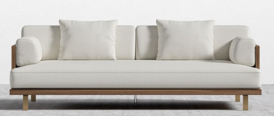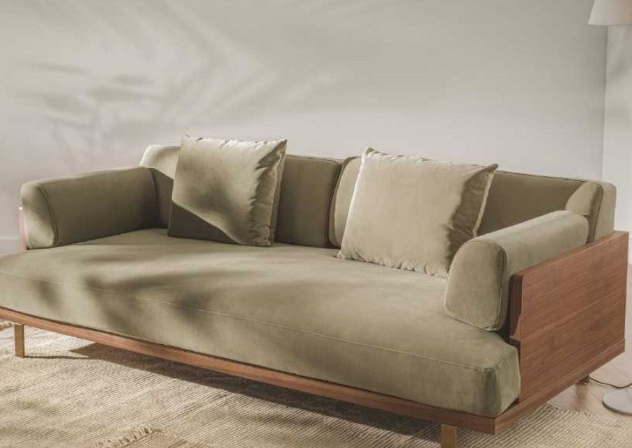 Discover timeless elegance with The Madalyn Sofa, a true homage to the minimalist beauty of Japanese architecture. Crafted with a sleek, smooth walnut frame, this sofa beautifully highlights the natural grain of the wood, surrounding plush, inviting cushions that promise comfort and style. Its clean, simple silhouette adorned in luxurious velvet creates an inviting centerpiece that effortlessly elevates any space. Perfect for those who appreciate understated sophistication and functional design.