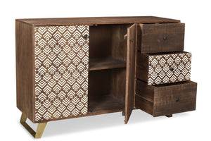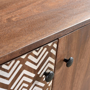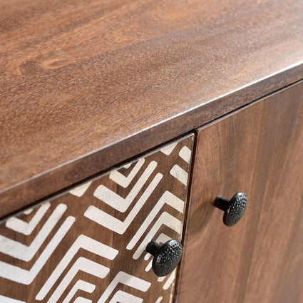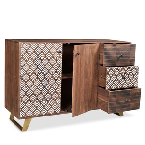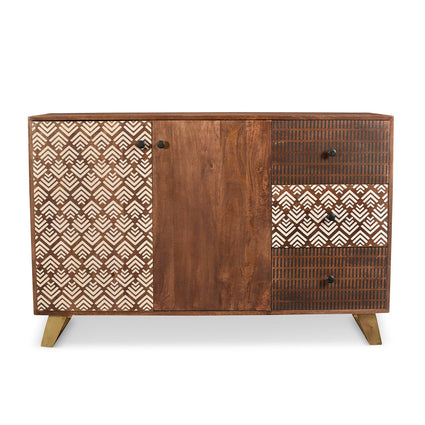 Transform any room in your home with the captivating design of these charcoal and white chevrons on solid Acacia wood. The use of retro bronze metal legs provides a striking contrast and adds a touch of elegance. Elevate your living space with the Olga Retro TV cabinet, side table, and coffee table. These pieces feature a printed geometric pattern and are expertly crafted from solid Acacia wood. With dimensions of 55" long, 18" wide, and 36" high, this sideboard requires assembly.