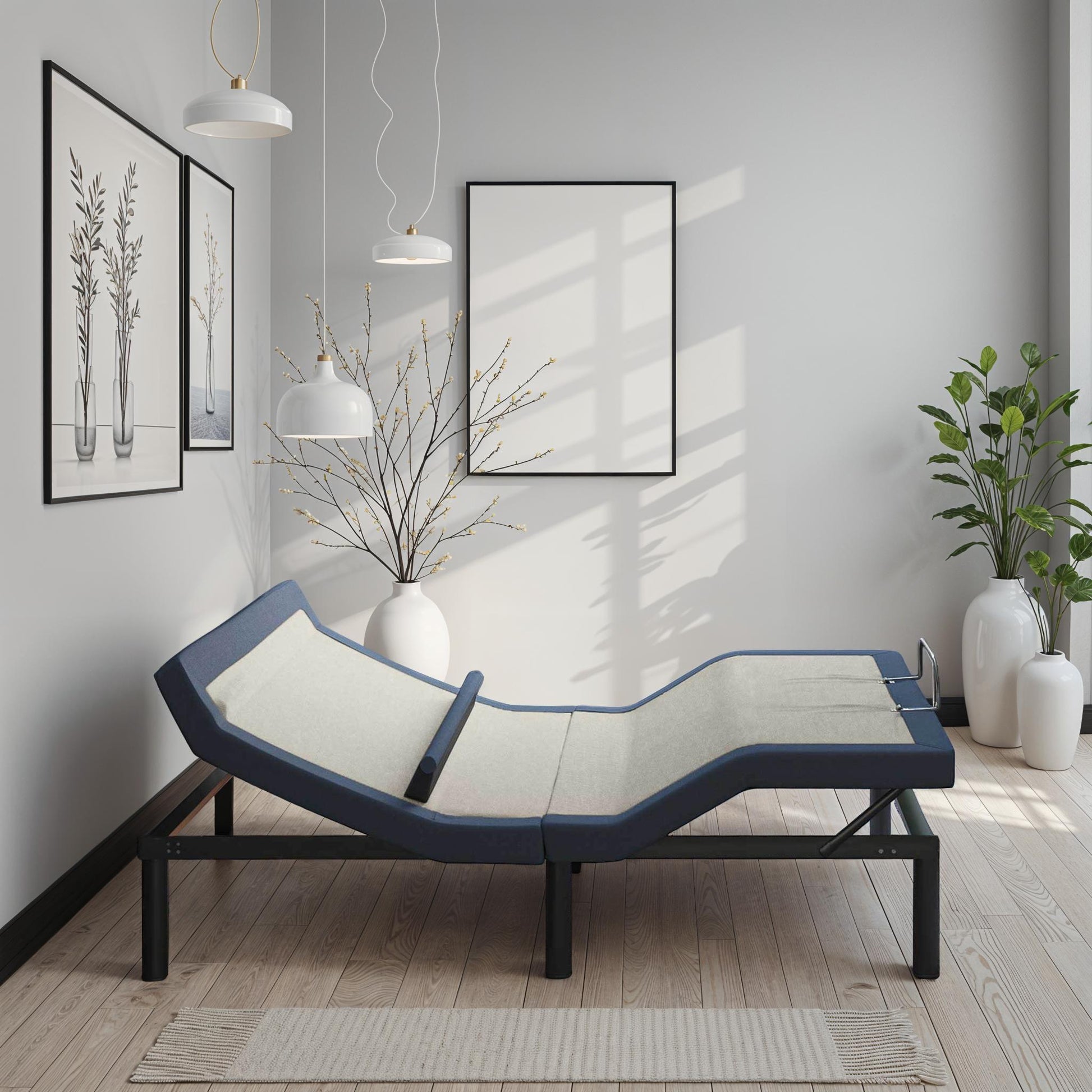 This adjustable bed base is designed for Twin XL mattresses and enhances bedroom comfort with customizable head, foot, and lumbar positioning. It fits well in modern bedroom settings, combining function with a sleek style.