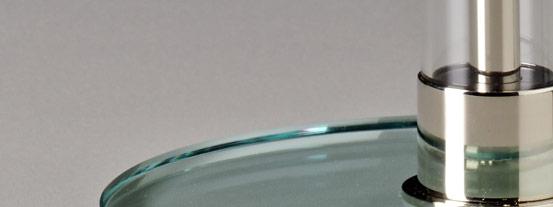 Materials: Clear glass base and post. Nickel-plated metal. Opaque globe. Authorized edition by Prof. Wilhelm Wagenfeld. Each lamp consecutively numbered and bears the TECNOLUMEN logo.
